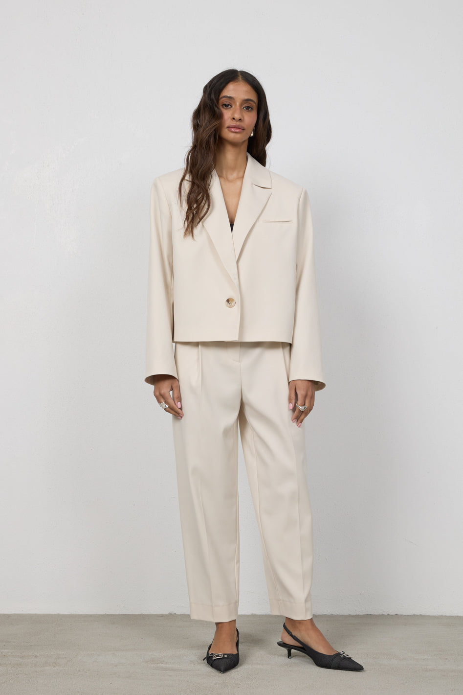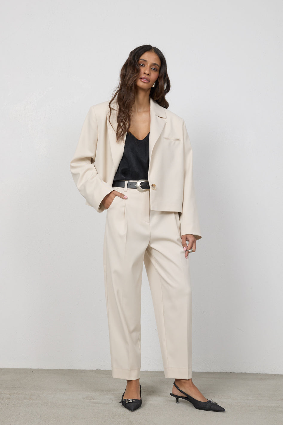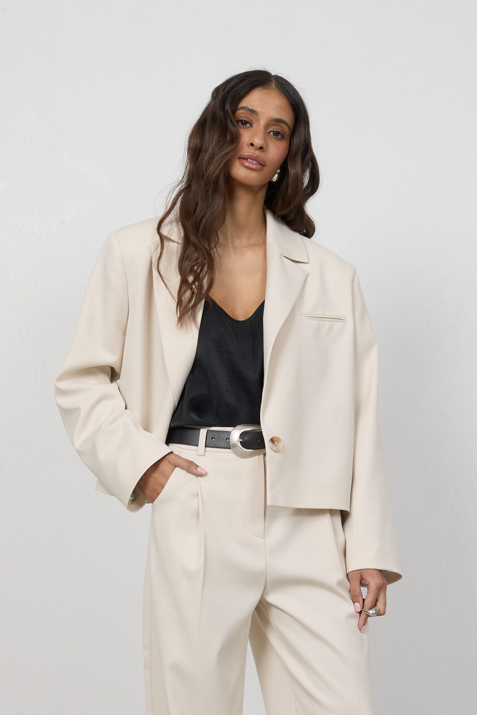 Tworzy komplet ze spodniami Elio lub Cleo, z którymi buduje spójny, elegancki garnitur. Przełam marynarkę jeansami lub luźnym topem, nadając stylizacji bardziej swobodny charakter.