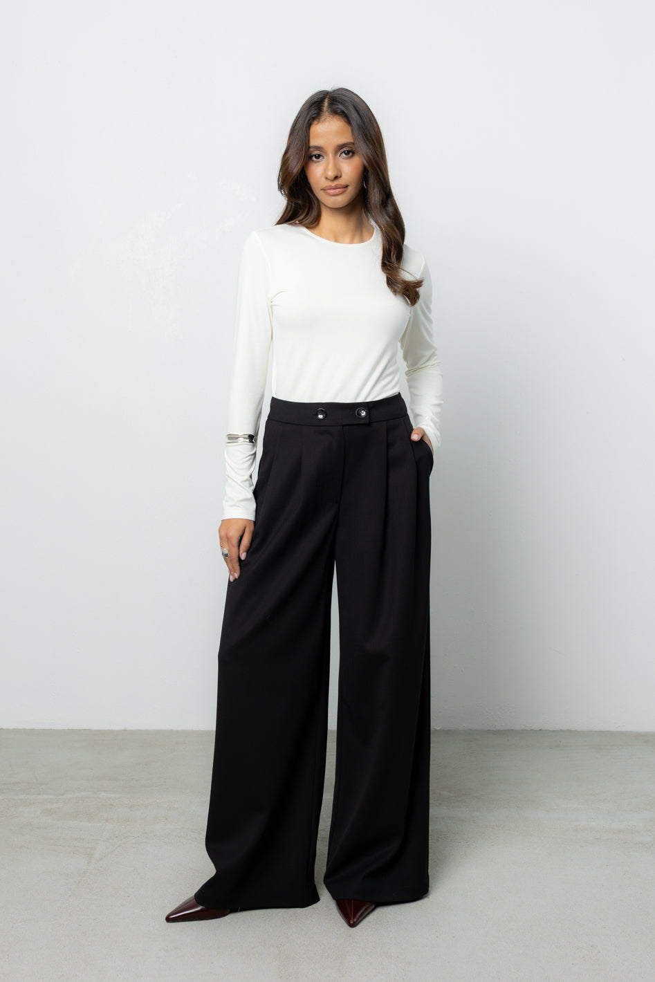 Spodnie Grego Petite zostały zaprojektowane z myślą o kobietach do 164 cm wzrostu. To ponadczasowe spodnie z szeroką nogawką, zakładkami i pasem, posiadającym dwa ozdobne guziki.